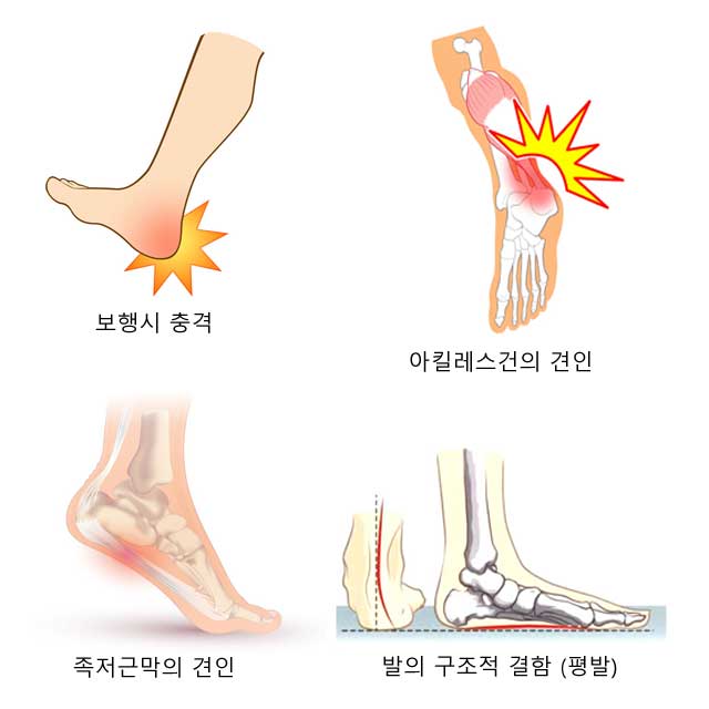평발 또는 요족 등으로 인해 발의 구조가 비정상적이면 종골에 비정상적인 압력이 작용하여 염증과 통증이 발생할 수 있습니다.