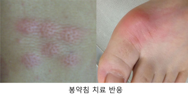 가장 빈발하는 반응으로는 봉약침을 주입한 부위가 붓고 가려워지고 열감이 발생하고, 치료 반응이 강할 때는 통증이 수 시간에서 1~3일 정도 느껴집니다.