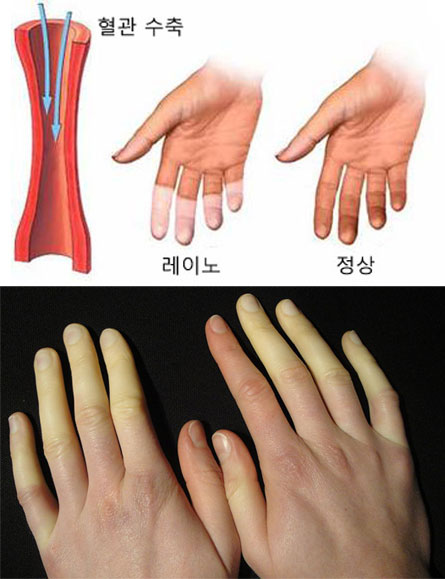 레이노 증후군은 추위 또는 심리적 변화(스트레스)에 의해 손발의 혈관이 수축하면서 허혈성 발작으로 손ㆍ발가락 피부가 창백해지거나 푸르게 변하고 10~15분 정도 지속된 이후 풀어지는데, 이때 손ㆍ발가락 피부색이 회복되고 붉어지면서 손발의 저림, 통증 등의 증상을 유발합니다.