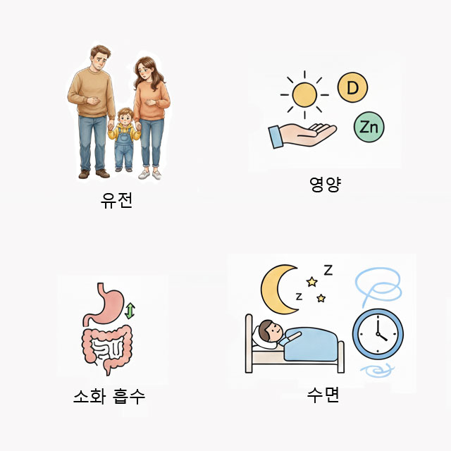 단순히 키만 작은 것이 아니라, 자주 아프거나 편식이 심하다면 몸 안의 '성장 에너지'가 다른 곳(질병 회복 등)에 쓰이고 있다는 신호일 수 있습니다.
