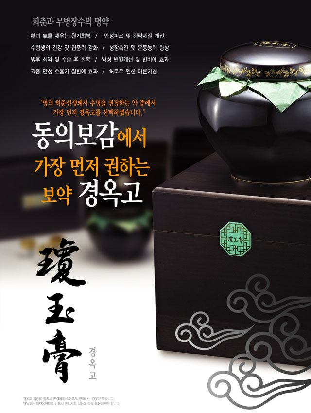 경옥고는 동의보감에 소개된 아주 많은 처방 중에 가장 먼저 나오는 처방입니다. 그만큼 건강하고 오래 살게 하는데 좋은 한약으로 체질과 남녀노소에 관계없이 인체 모든 기관의 활력을 보강하고 허약한 기운을 회복하는데 효과가 뛰어난 명약입니다.