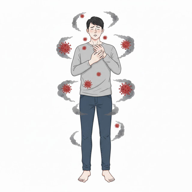 독감 바이러스는 호흡기 상피 세포를 직접 공격합니다. 우리 몸의 면역계가 이에 대응하는 과정에서 막대한 에너지를 소모합니다. 바이러스가 사멸해도 손상된 기관지 점막이 재생되기까지는 시간이 걸리며, 이 과정에서 신경이 노출되어 작은 자극에도 기침이 터져 나오는 '기도 과민성' 상태가 유지됩니다. 또한, 폭풍처럼 강력하게 휘몰아친 면역 반응 과정에서 발생한 염증 물질들이 전신을 돌며 피로감과 근육통을 유발합니다.