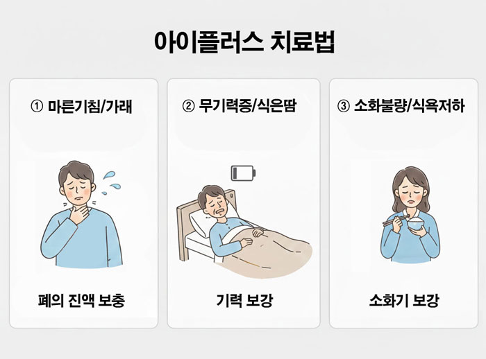 ㆍ아이플러스 솔루션 : 폐의 음기를 보충하는 맥문동, 천문동 등의 약재를 사용하여 기관지를 촉촉하게 적셔줍니다. 이는 현대의학의 진해거담제와 달리 점막 자체의 재생력을 높이는 데 목적이 있습니다.