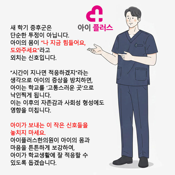 ㆍ한의학적 ‘기혈부족(氣血不足)’ : 기초 에너지가 부족한 아이는 환경 변화라는 ‘풍랑’을 견딜 힘이 없습니다. 체력이 없으니 짜증이 먼저 나고, 면역력이 떨어져 새 학기만 되면 감기나 비염을 달고 살게 되는 것입니다.