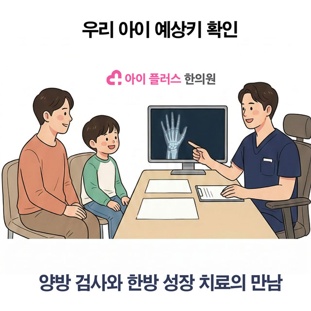 ㆍ아이플러스한의원 정밀 판독 : 성장판의 열린 정도와 부모님의 키(유전), 현재 성장 속도, 촬영된 엑스레이 데이터를 종합하여, 아이의 남은 성장 가능성과 예상 최종 키를 세밀하게 분석합니다.